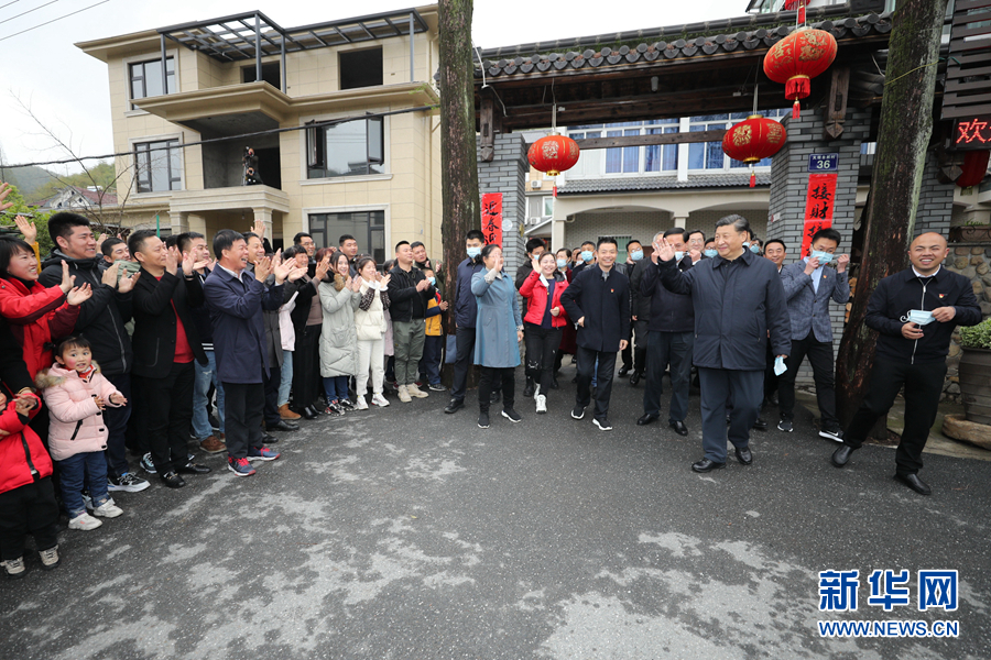 3月29日至4月1日,中共中央總書記、國(guó)家主席、中央軍委主席習(xí)近平在浙江考察。這是3月30日,習(xí)近平在湖州市安吉縣天荒坪鎮(zhèn)余村考察時(shí),向村民們揮手致意。 新華社記者 鞠鵬 攝