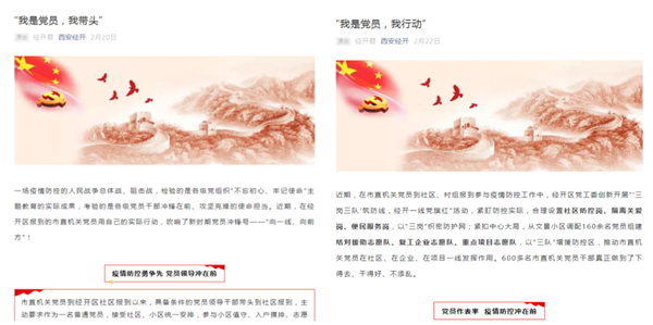 2月20日,經(jīng)開區(qū)通過(guò)微信公眾號(hào)、新浪微博策劃制作《我是黨員,我?guī)ь^》《我是黨員,我行動(dòng)》系列網(wǎng)絡(luò)稿件,刊播下沉社區(qū)一線的黨員干部事跡10期,以小見大,充分展現(xiàn)基層黨組織和黨員干部勇當(dāng)先鋒、敢打先陣的帶頭作用。