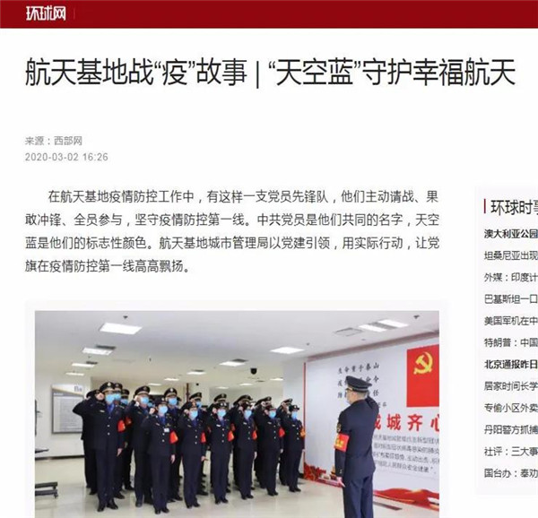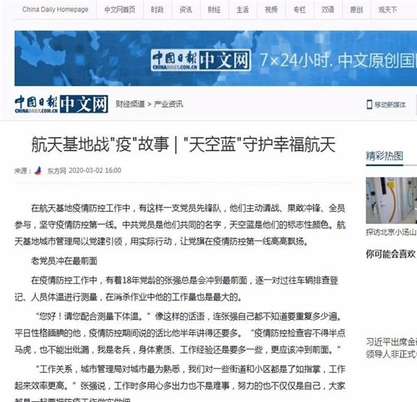 3月2日,航天基地《“天空藍(lán)”守護(hù)幸福航天》,講述了擁有18年黨齡的張強(qiáng)、退役士官魏斌、工作人緣好李鵬飛用行動(dòng)展現(xiàn)共產(chǎn)黨人政治本色的積極實(shí)踐。國(guó)際在線、中國(guó)日?qǐng)?bào)網(wǎng)、環(huán)球網(wǎng)、鳳凰網(wǎng)、西部網(wǎng)、三秦網(wǎng)、搜狐等近20家中央、省級(jí)、市級(jí)網(wǎng)絡(luò)媒體轉(zhuǎn)發(fā),網(wǎng)友產(chǎn)生強(qiáng)烈共鳴。