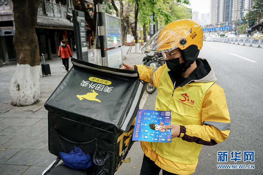送完這一單后,王淞又趕往下一個取餐點,他希望把更多的宣傳制品送出去。王淞表示,在維護國家安全上,人人有責,作為一名外賣小哥的責任,就是通過他們的傳遞,讓更多的人了解國家安全相關知識。新華網(wǎng) 韓夢霖 攝