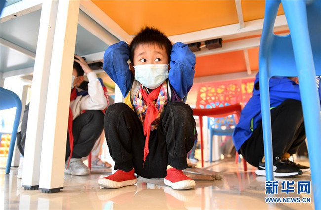 5月10日,合肥市淝南社區(qū)的兒童在進(jìn)行地震防災(zāi)應(yīng)急避險(xiǎn)演練。 新華社記者 劉軍喜 攝