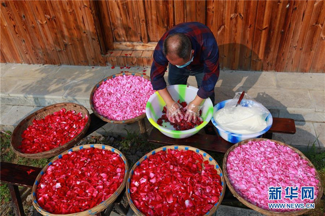 5月14日,在貴州省畢節(jié)市百里杜鵑戛木管理區(qū)中塘村鮮花基地,村民在加工鮮花糖。新華社發(fā)(史開心 攝)
