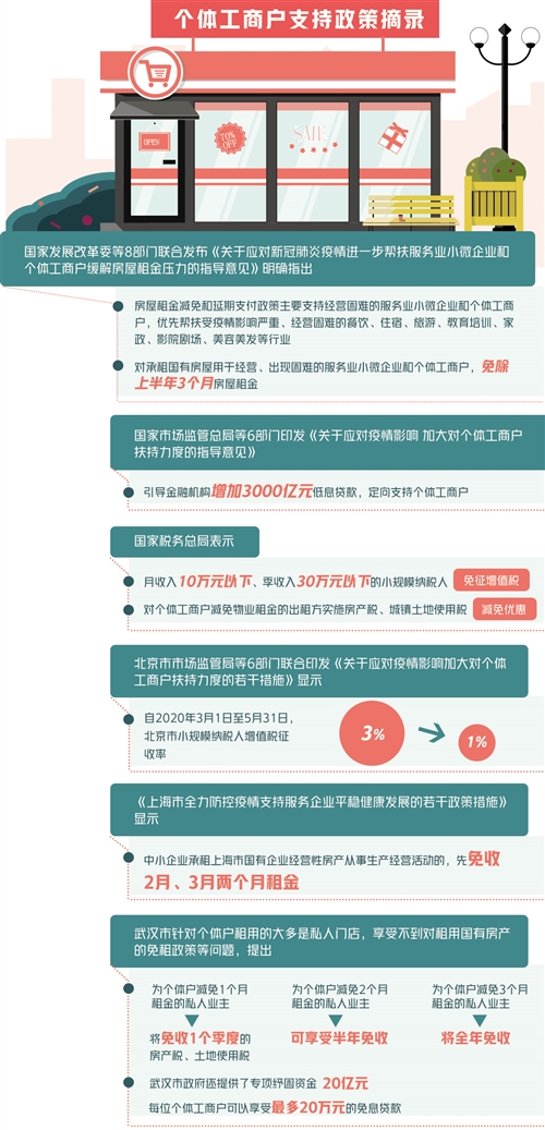 顯而易見,房租是個(gè)體工商戶最大的成本。黨中央、國(guó)務(wù)院一直高度關(guān)注中小微企業(yè)、個(gè)體戶的房租減免問題,并作出多次部署。早在疫情暴發(fā)初期,市場(chǎng)監(jiān)管總局等六部門出臺(tái)的《關(guān)于應(yīng)對(duì)疫情影響 加大對(duì)個(gè)體工商戶扶持力度的指導(dǎo)意見》就提出鼓勵(lì)各地結(jié)合實(shí)際減免個(gè)體工商戶房租。