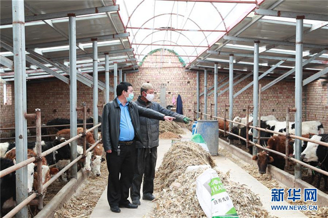 在甘肅省臨夏回族自治州廣河縣莊窠集鎮(zhèn)西坪村,全國(guó)人大代表馬天龍(左)和養(yǎng)牛戶(hù)馬志德討論養(yǎng)殖問(wèn)題(3月10日攝)。新華社發(fā)(杜哲宇 攝)