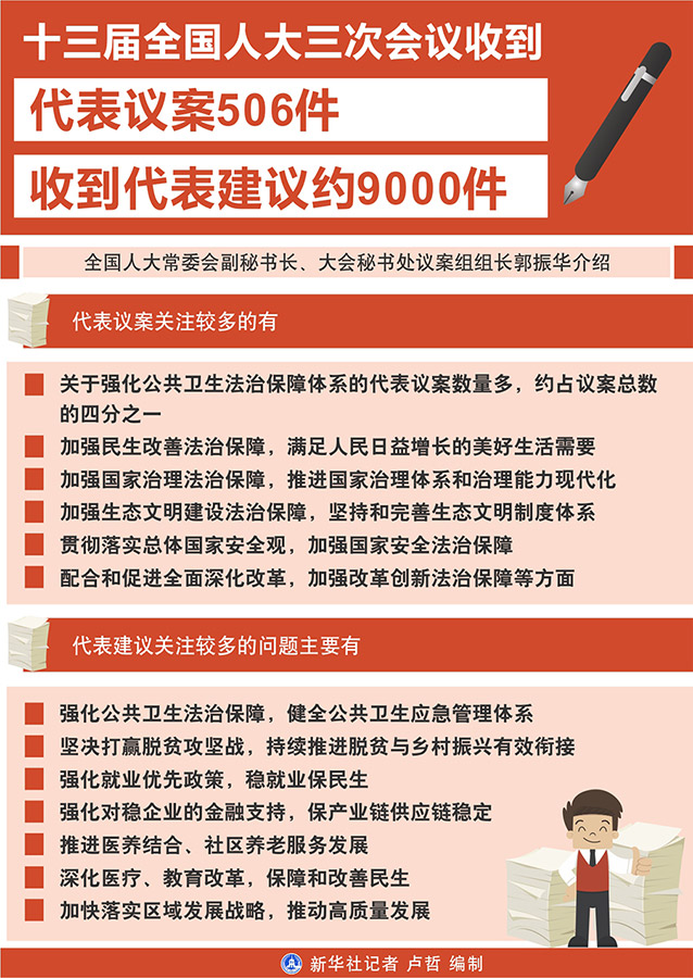 記者26日從十三屆全國人大三次會議秘書處獲悉,到大會主席團(tuán)決定的代表提出議案截止時(shí)間5月25日12時(shí),大會秘書處共收到代表提出的議案506件。同時(shí),收到代表建議約9000件。