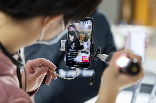 在鄭州市一家商場,售貨員利用網(wǎng)絡直播平臺介紹手機商品。新華社供圖