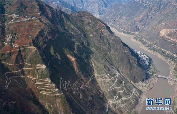 金陽(yáng)縣蘆稿鎮(zhèn)大灣子村12公里左右的通村公路,28個(gè)彎蜿蜒盤旋在金沙江峽谷懸崖絕壁邊(6月7日攝,無人機(jī)照片)。坐落在金沙江畔的四川省金陽(yáng)縣是國(guó)家級(jí)深度貧困縣,境內(nèi)群山連綿起伏,海拔落差大,眾多村寨處于高山或者高半山上,道路施工難度大。近年來,當(dāng)?shù)卣畬⒔煌ㄗ鳛槊撠毠?jiān)的先導(dǎo)性工程,路越修越寬、越修越好,成為當(dāng)?shù)厝罕姷拿撠氈赂宦贰=刂?019年底,金陽(yáng)縣實(shí)現(xiàn)所有鄉(xiāng)鎮(zhèn)通油路、建制村通硬化路,鄉(xiāng)道里程達(dá)329.9公里,村道里程達(dá)866.8公里。新華社記者江宏景攝