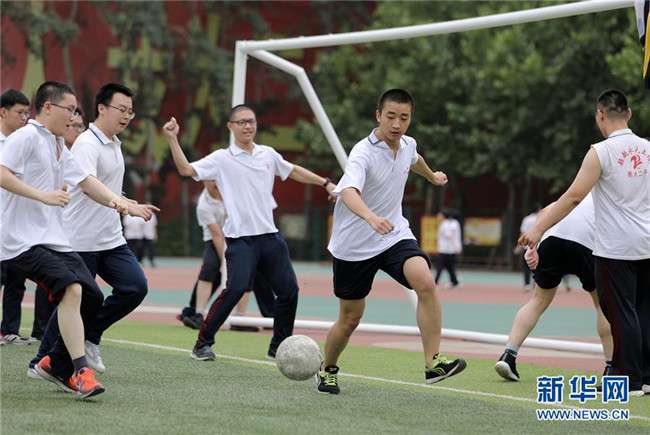 6月9日,河北省衡水市第二中學(xué)的高三學(xué)生在操場(chǎng)上踢足球。新華社記者 朱旭東 攝