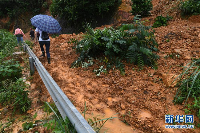 在廣西永??h堡里鎮(zhèn)板峽村,人們經(jīng)過(guò)山體滑坡路段(6月9日攝)。新華社記者 陸波岸 攝