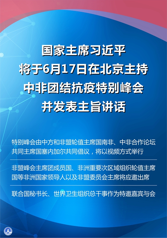 外交部發(fā)言人華春瑩16日宣布:國家主席習(xí)近平將于6月17日在北京主持中非團(tuán)結(jié)抗疫特別峰會,并發(fā)表主旨講話。