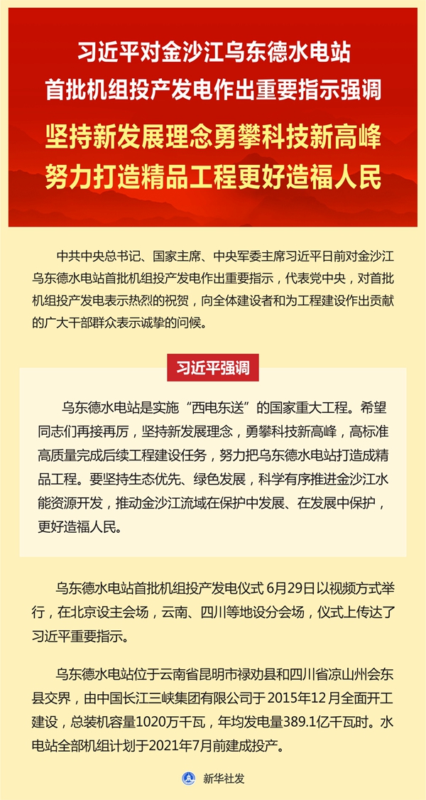 中共中央總書(shū)記、國(guó)家主席、中央軍委主席習(xí)近平日前對(duì)金沙江烏東德水電站首批機(jī)組投產(chǎn)發(fā)電作出重要指示,代表黨中央,對(duì)首批機(jī)組投產(chǎn)發(fā)電表示熱烈的祝賀,向全體建設(shè)者和為工程建設(shè)作出貢獻(xiàn)的廣大干部群眾表示誠(chéng)摯的問(wèn)候。