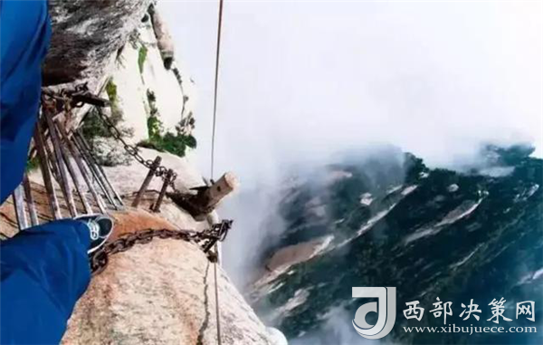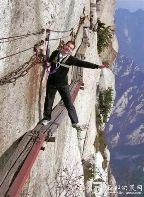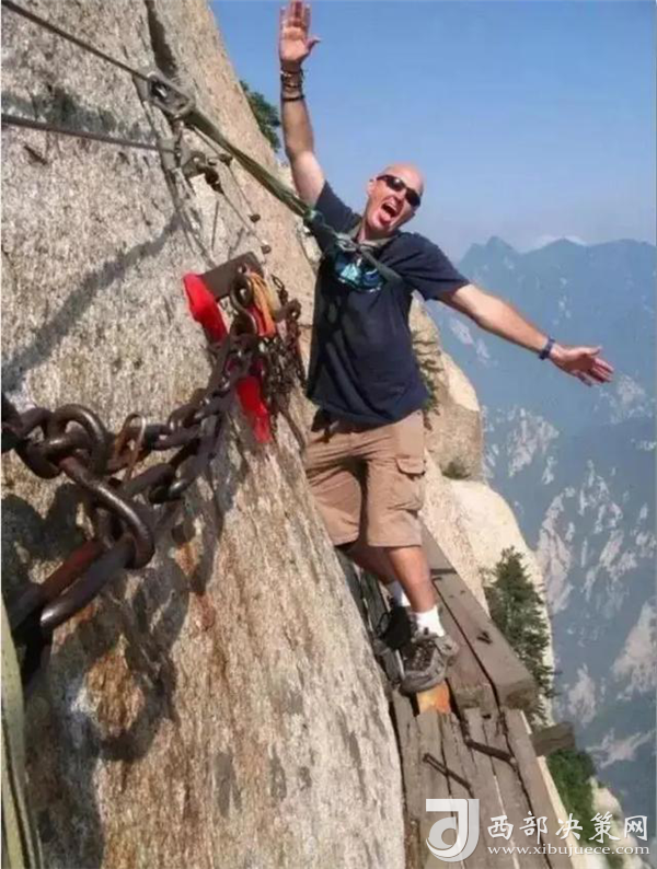 喜歡攀巖徒步,似乎是很多老外的一種標志性運動。幾個熱愛徒步攀巖的老外,在華山的棧道上擺pose,挑戰(zhàn)這種世界上最危險的徒步棧道。