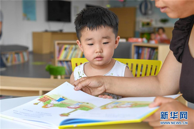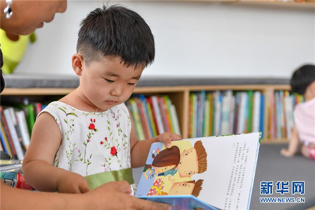 7月2日,在長春市少年兒童圖書館平陽社區(qū)繪本主題分館,家長為小朋友講故事。新華社記者 張楠 攝