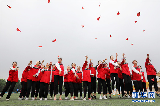 2020年7月3日,河南省溫縣一中高三學(xué)生在學(xué)校操場上做減壓游戲。 2020年全國高考即將拉開帷幕,同學(xué)們從容應(yīng)對(duì),以良好的狀態(tài)迎接高考的到來。 新華社發(fā)(徐宏星 攝)