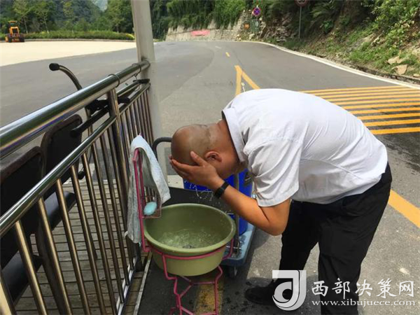 每來(lái)一輛車(chē),聶鑫便急忙跑上去給剛剛停下的車(chē)轱轆下墊上防滑支架,柴小東則忙著給駕駛員舀水、遞風(fēng)油精,韓繼堂則上車(chē)檢查游客系安全帶的情況。駕駛員洗過(guò)臉后,他們將盆里用過(guò)的水迅速換上干凈的水,等待下一班駕駛員的到來(lái)。每天不厭其煩的重復(fù)著墊支架、舀水、換水、登車(chē)檢查的動(dòng)作,不會(huì)厭煩嗎?當(dāng)我看到他們臉上的微笑和滴落的汗珠時(shí),答案就不言而喻了,我試著問(wèn)他們,現(xiàn)在最大的愿望是什么呢?我聽(tīng)到的是一句最平凡而質(zhì)樸的回答,“最大的愿望是盼望能吹來(lái)一點(diǎn)涼風(fēng)。”
