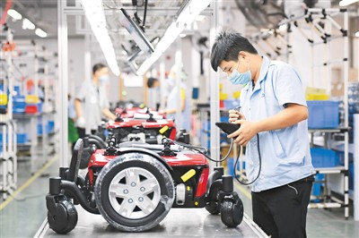 近來,江西省豐城市外貿(mào)企業(yè)通過與電商平臺合作、云推介等方式促進企業(yè)穩(wěn)產(chǎn)增效。圖為豐城市捷和電機(江西)有限公司員工在生產(chǎn)線上組裝電動輪椅車,準(zhǔn)備出口至歐洲、中東、非洲等地市場。周 亮攝(人民視覺)