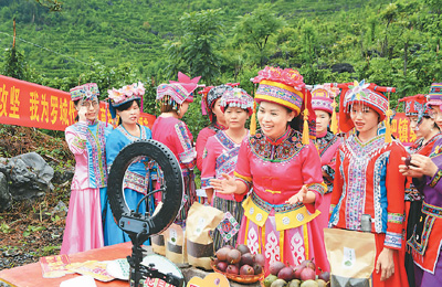 7月11日,廣西羅城仫佬族自治縣“仫佬十姐妹”直播團隊在四把鎮(zhèn)集環(huán)村介紹當(dāng)?shù)剞r(nóng)特產(chǎn)品,通過電商直播“帶貨”,助力脫貧攻堅。韋如代攝(人民視覺)