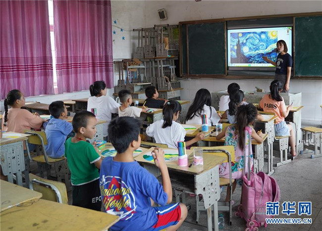 7月23日,在廬山市蛟塘鎮(zhèn)中心小學安置點,老師給孩子們講解美術(shù)作品。新華社記者 張浩波 攝