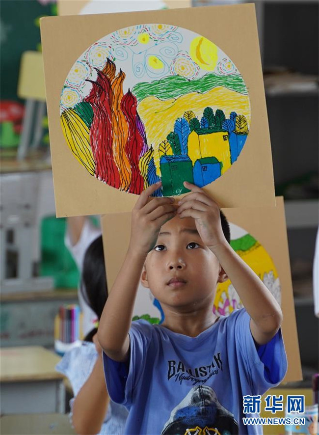 7月23日,在廬山市蛟塘鎮(zhèn)中心小學安置點,一名小朋友展示自己的繪畫作品。新華社記者 張浩波 攝