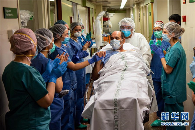 5月7日,在西班牙巴塞羅那的一家醫(yī)院,一名新冠患者在離開重癥監(jiān)護室前和醫(yī)護人員握手致意。 新華社發(fā)(弗朗西斯科·阿維亞攝)