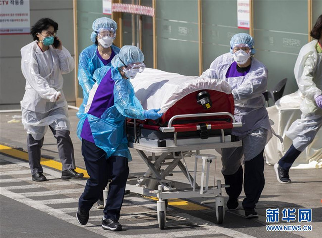 3月4日,在韓國大邱慶北大學醫(yī)院,醫(yī)護人員轉送患者。 新華社發(fā)(李相浩攝)