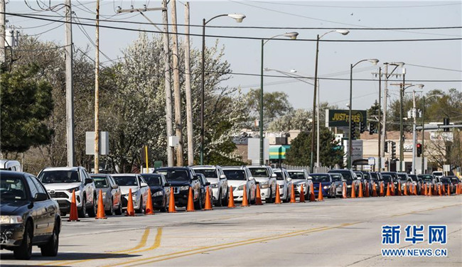 5月6日,在美國伊利諾伊州芝加哥西北部一處新冠病毒檢測點,人們駕車排起長隊等待檢測。 新華社發(fā)(喬爾·萊納攝)