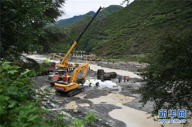 8月23日,搶險人員在舟曲縣曲告納鎮(zhèn)境內(nèi)被沖毀的鐵壩河1號橋旁開展道路搶通作業(yè)。 新華社記者 郎兵兵 攝