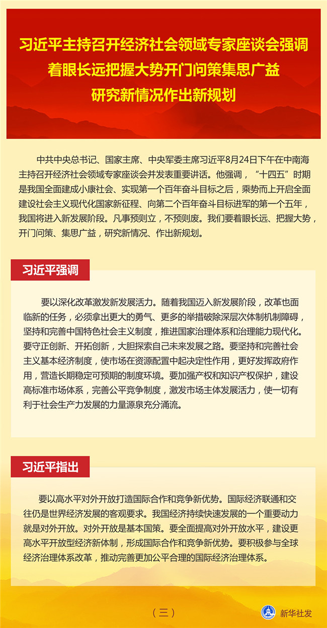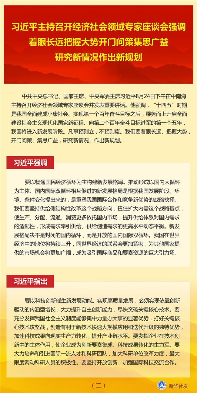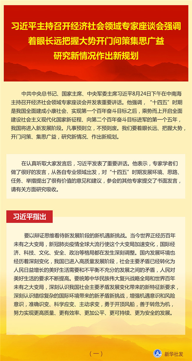 中共中央總書記、國家主席、中央軍委主席習近平8月24日下午在中南海主持召開經(jīng)濟社會領(lǐng)域?qū)<易剷l(fā)表重要講話。他強調(diào),“十四五”時期是我國全面建成小康社會、實現(xiàn)第一個百年奮斗目標之后,乘勢而上開啟全面建設(shè)社會主義現(xiàn)代化國家新征程、向第二個百年奮斗目標進軍的第一個五年,我國將進入新發(fā)展階段。凡事預則立,不預則廢。我們要著眼長遠、把握大勢,開門問策、集思廣益,研究新情況、作出新規(guī)劃。