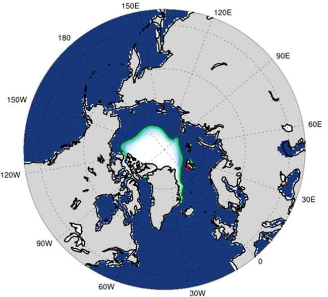 ▲中科院大氣物理研究所ANSO IAP-LASG北極海冰動(dòng)力集合預(yù)測(cè)系統(tǒng)6月份發(fā)布的9月份北極海冰范圍預(yù)測(cè),綠色實(shí)線為預(yù)測(cè)的北極海冰范圍,白色區(qū)域?yàn)楹1鶇^(qū)域。圖片來源:中國科學(xué)報(bào)