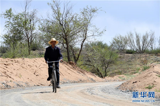 在古浪縣八步沙林場,場長郭萬剛騎著自行車巡護林場(9月1日攝)。 新華社記者 范培珅 攝