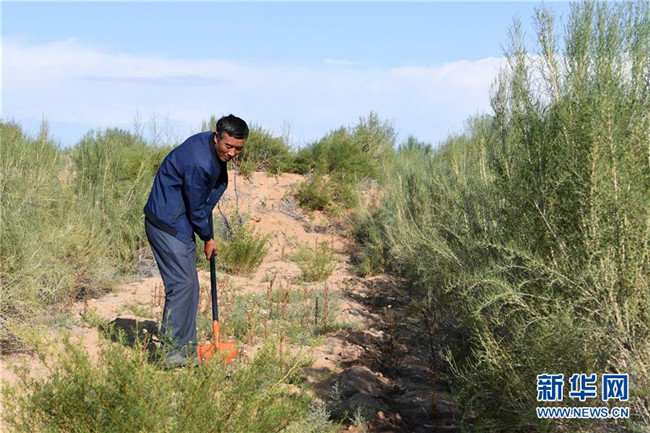 在古浪縣黃花灘生態(tài)移民區(qū)9號移民點,張世俊在林間忙碌(9月1日攝)。 新華社記者 范培珅 攝