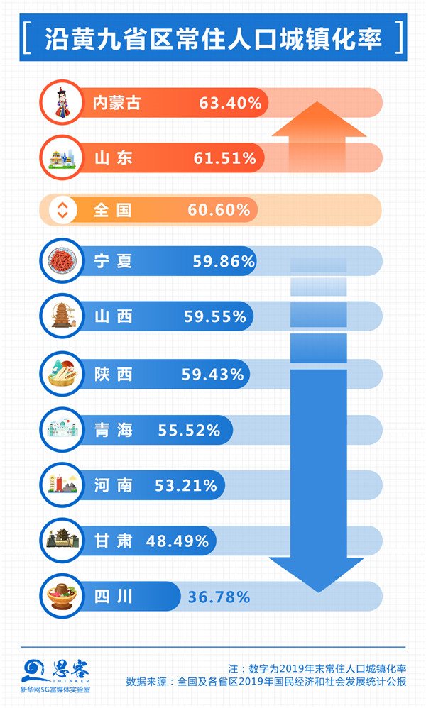 鄭州、西安、濟(jì)南等中心城市和中原等城市群帶動區(qū)域內(nèi)城市及城市群加快建設(shè),但目前九省區(qū)城鎮(zhèn)化水平及中心城市輻射帶動能力仍有待提升。沿黃九省區(qū)僅有內(nèi)蒙古和山東的常住人口城鎮(zhèn)化率高于全國平均水平。從中心城市看,流域內(nèi)鄭州和西安的地區(qū)生產(chǎn)總值在九大國家中心城市中處在相對較后的位置。西寧、蘭州、銀川等首位度相對較高的省會城市輻射帶動能力也有限。
