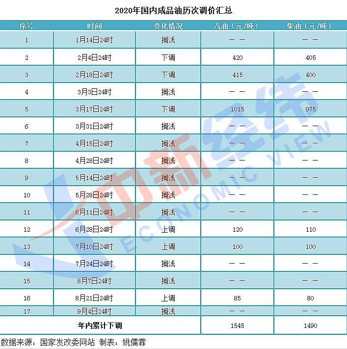 據(jù)中新經(jīng)緯客戶端統(tǒng)計,2020年以來國內(nèi)成品油調(diào)價已進行了十七輪,具體為上調(diào)三次、下調(diào)三次,擱淺十一次,汽油總計下調(diào)了1545元/噸,柴油總計下調(diào)了1490元/噸。其中,3月31日至6月11日的6輪調(diào)整均因國際市場原油價格低于40美元/桶而擱淺。如果本輪成品油調(diào)價下調(diào),2020年國內(nèi)成品油調(diào)價將呈現(xiàn)“三漲四跌十一擱淺”的格局。
