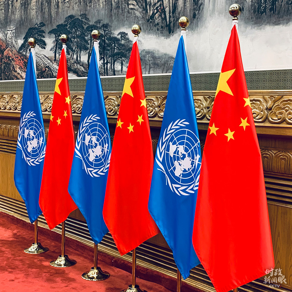 △視頻會見現(xiàn)場擺放的中國國旗和聯(lián)合國旗(總臺央視記者范一鳴拍攝)