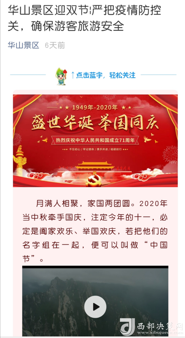 9月30日至10月8日期間,景區(qū)官方微信以歡度雙節(jié)、防疫安全、熱心服務、旅游攻略等為主題發(fā)布宣傳軟文23篇,累計閱讀量4.2萬人次,分享及轉發(fā)量共計1430次;官方微博向游客及時發(fā)布景區(qū)天氣、客流、景色實況、溫馨提示等景區(qū)度節(jié)綜合信息共計102條,閱讀量高達101.9萬次,并耐心、細致解答網友私信、評論共計532條;通過抖音平臺發(fā)布景區(qū)公告、秋日美景、好人好事等短視頻及圖片錦集共計18條,播放量共計 1.4萬次。