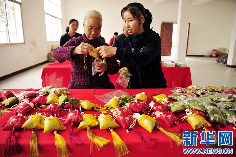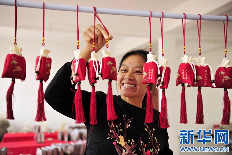 10月19日,在黃茅鎮(zhèn)軍屯村扶貧車(chē)間,村民在制作迷迭香袋。新華網(wǎng)發(fā) 鄧龍華 攝