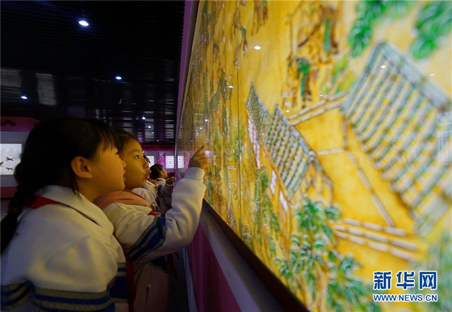 10月19日,小學生們在中國灤州皮影博物館內(nèi)參觀一幅皮影長卷。新華社記者 牟宇 攝