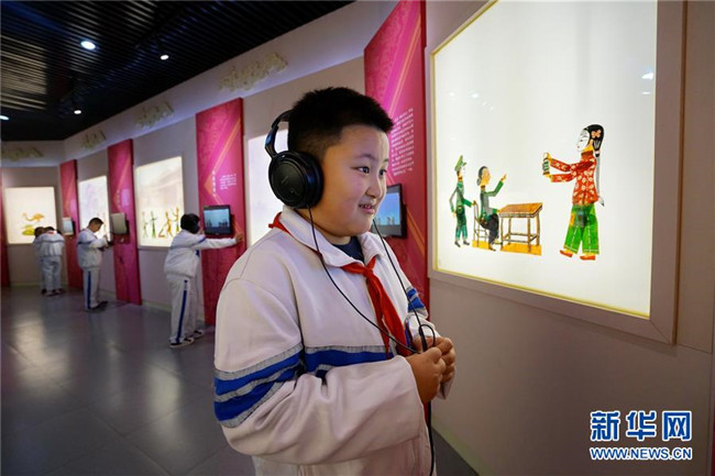 10月19日,小學生在中國灤州皮影博物館內(nèi)收聽皮影戲唱腔。新華社記者 牟宇 攝