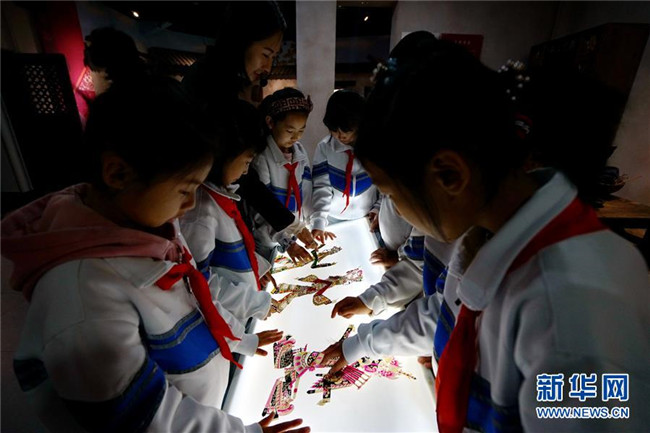 10月19日,小學生們在中國灤州皮影博物館內(nèi)了解皮影人制作技藝。新華社記者 牟宇 攝