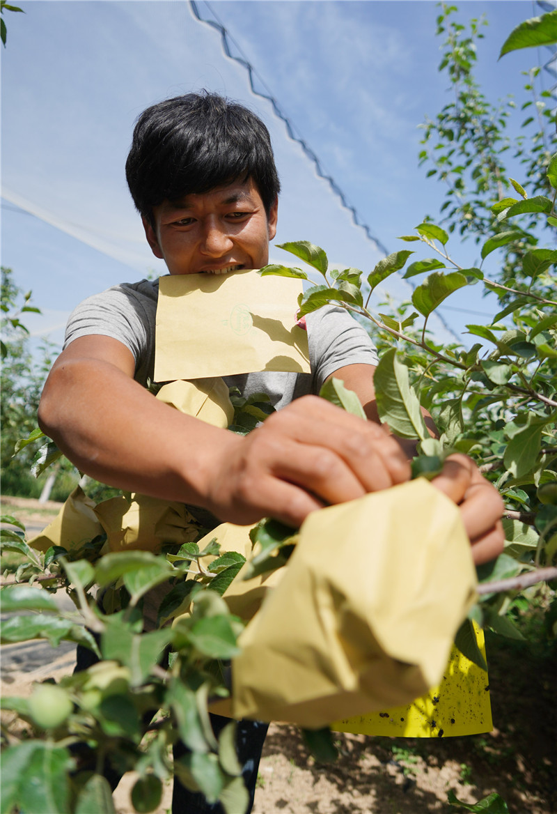 陜西省延安市梁家河村村民在給蘋(píng)果套袋(2018年5月24日攝)。新華社記者 邵瑞 攝