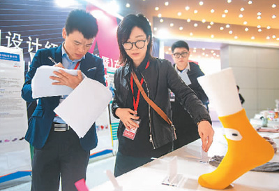 日前,中國設計紅星獎(諸暨)產品設計大賽在浙江省諸暨市開啟現(xiàn)場實物評審。為推動襪業(yè)“設計+科技”的創(chuàng)新,今年的主題聚焦襪業(yè),共有387件擁有外觀設計專利的作品入圍實物終評。江 漢攝(新華社發(fā))