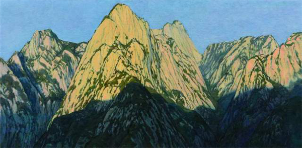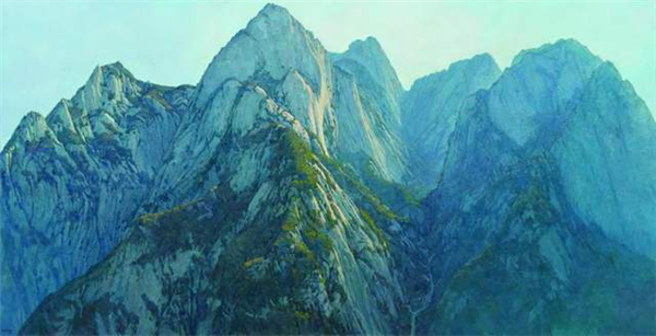 作品《神屏》,始于2013年春季寫(xiě)生,東仰太華的清晨,主峰巍峨,山谷靜悄悄的,逆光下的高山統(tǒng)一在多層次的藍(lán)色調(diào)里,復(fù)雜的山石結(jié)構(gòu)則需要反反復(fù)復(fù)耐心的修改塑造,畫(huà)長(zhǎng)三米九,高兩米。