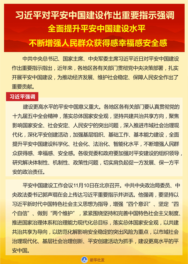 新華社北京11月11日電 中共中央總書記、國家主席、中央軍委主席習(xí)近平近日對(duì)平安中國建設(shè)作出重要指示指出,近年來,各地區(qū)各有關(guān)部門貫徹黨中央決策部署,扎實(shí)開展平安中國建設(shè),為推動(dòng)經(jīng)濟(jì)發(fā)展、維護(hù)社會(huì)穩(wěn)定、保障人民安全作出了重要貢獻(xiàn)。