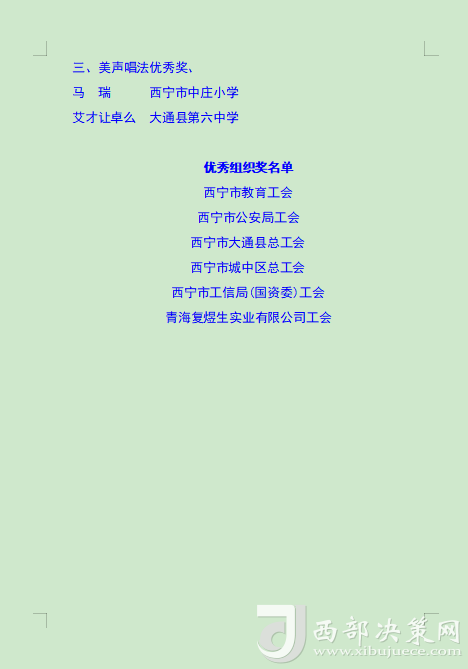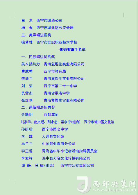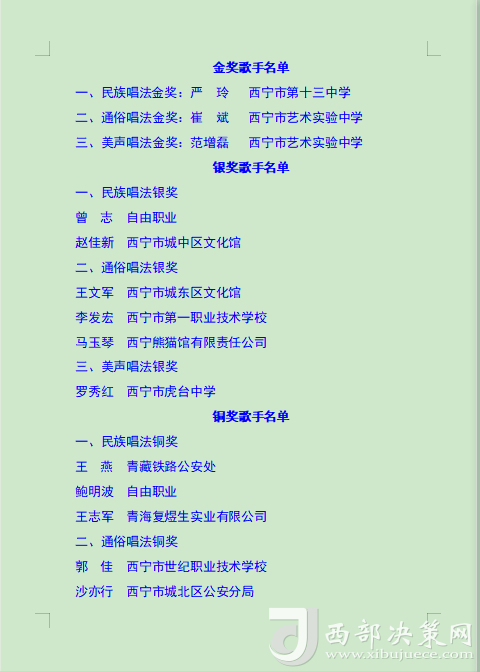 本次比賽旨在通過歌手們的激情演繹,增強全市廣大職工群眾的獲得感、幸福感、安全感,展現(xiàn)西寧市職工群眾的時代風(fēng)貌,進一步營造弘揚勞模精神、勞動精神、工匠精神的濃厚氛圍,為更高水平打造綠色發(fā)展樣板城市建設(shè)新時代幸福西寧增強信心、凝聚力量。(后附獲獎名單)。