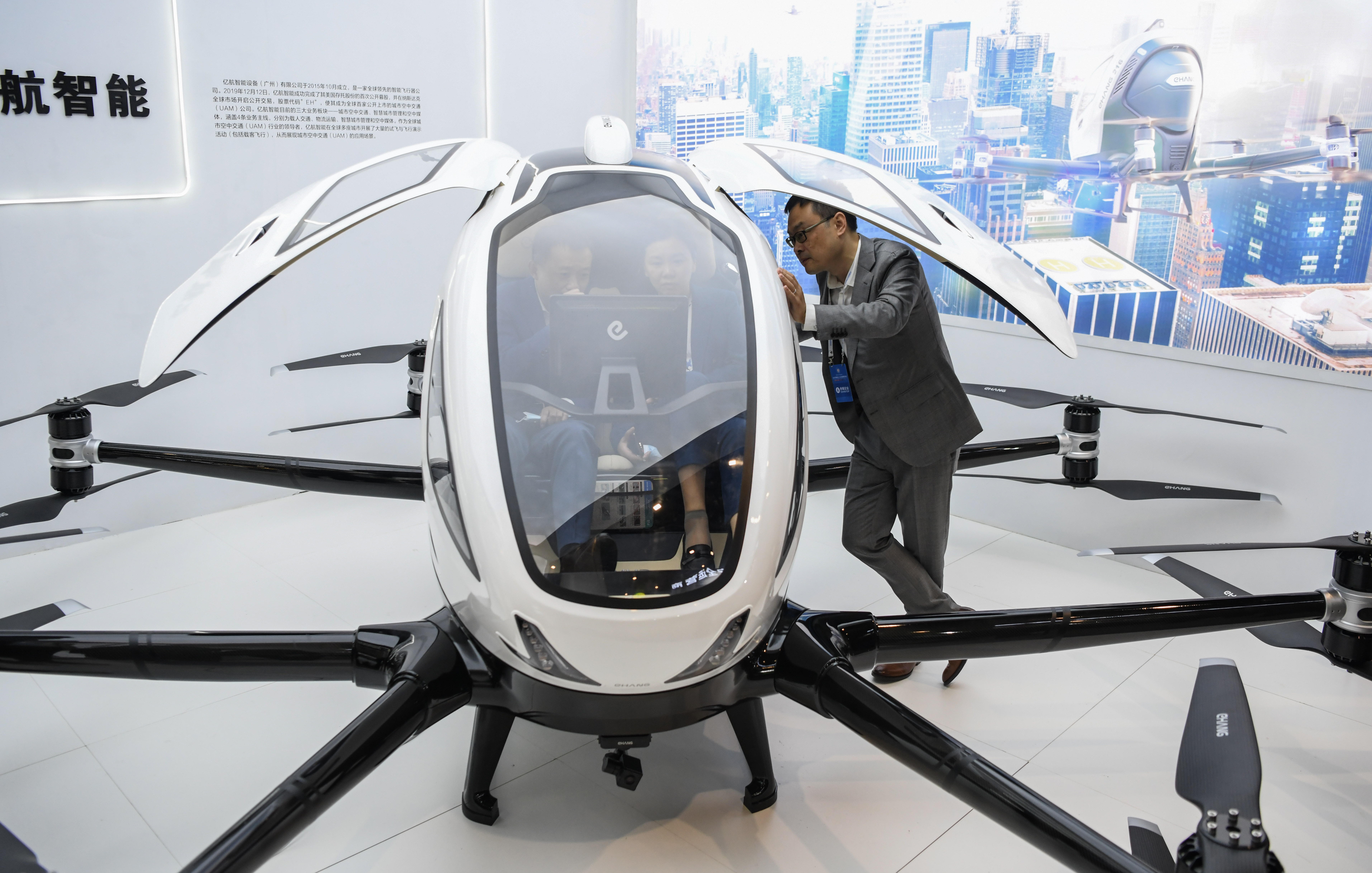 11月19日至21日,2020中國5G+工業(yè)互聯(lián)網(wǎng)大會在位于武漢的中國光谷科技會展中心舉行,大會特色活動(dòng)“5G+工業(yè)互聯(lián)網(wǎng)成果展”同步舉行。圖為11月19日,參觀者了解一臺自動(dòng)駕駛飛行器。新華社記者 程敏 攝