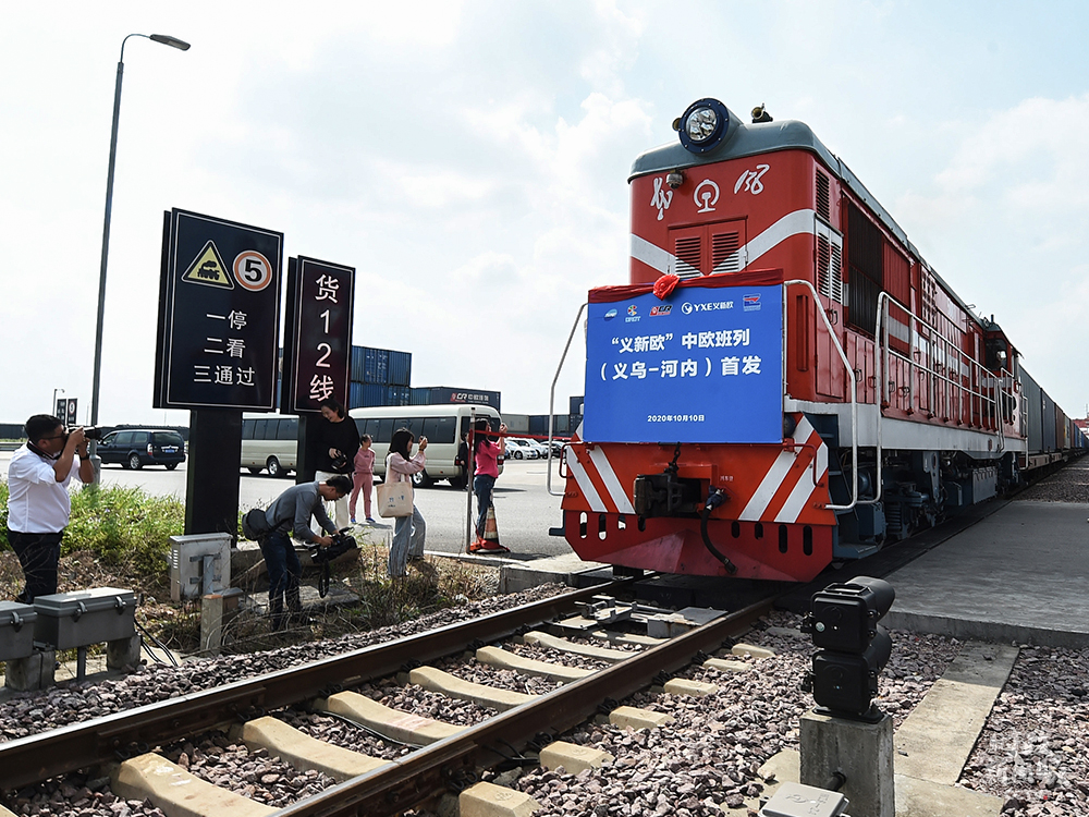 △今年10月10日,“義新歐”中歐班列(義烏—河內(nèi))從義烏西站首發(fā)啟程,最終將抵達(dá)越南河內(nèi)站。這是該班列首次開(kāi)通面向東南亞國(guó)家和地區(qū)的南向通道。