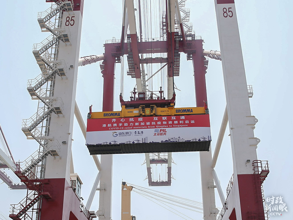 △今年4月份,“順城”輪從青島前灣港出發(fā),沿“一帶一路”航線將防疫物資送往新加坡。