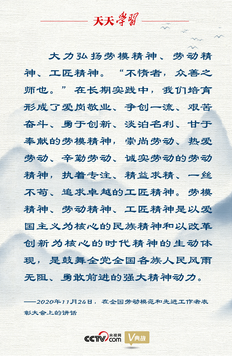在講話中,習近平總書記還用“不惰者,眾善之師也”這句古語,深刻詮釋勞模精神、勞動精神、工匠精神的實質(zhì),指出勞模精神、勞動精神、工匠精神是以愛國主義為核心的民族精神和以改革創(chuàng)新為核心的時代精神的生動體現(xiàn),是鼓舞全黨全國各族人民風雨無阻、勇敢前進的強大精神動力。