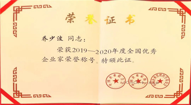 12月1日,以“弘揚優(yōu)秀企業(yè)家精神,勇于創(chuàng)新擔當奉獻”為主題的“2020年全國企業(yè)家活動日暨中國企業(yè)家年會”在廣東省東莞市舉行。會上表彰了154名優(yōu)秀企業(yè)家,公司董事長、總經理喬少波喜獲“2019-2020年全國優(yōu)秀企業(yè)家”稱號。