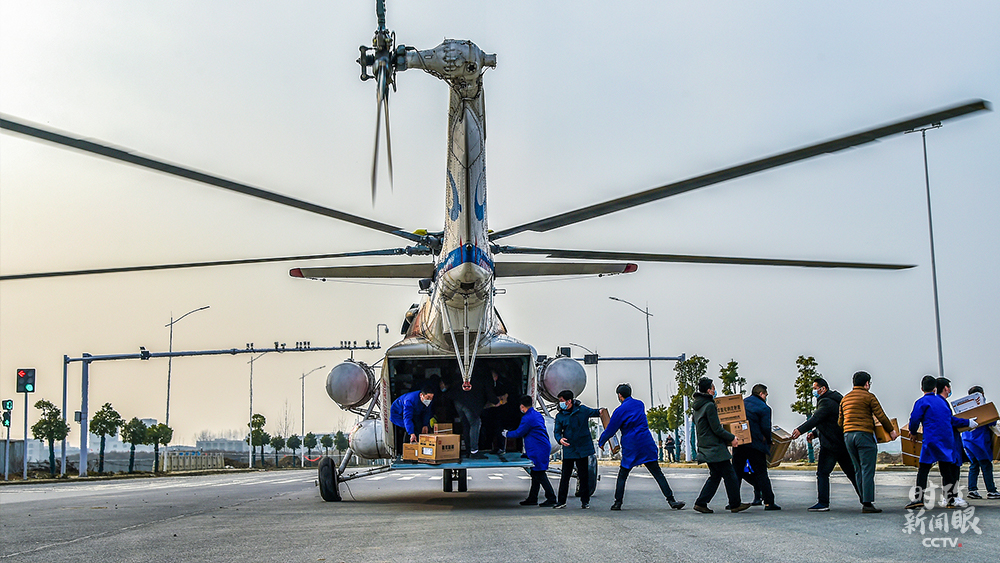 △2月3日,湖北襄陽(yáng)工作人員正在從直升機(jī)上卸下防疫物資。